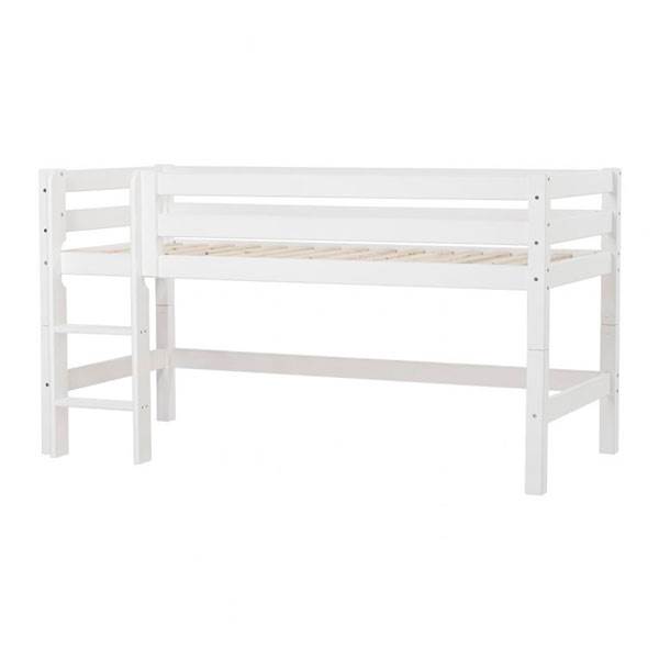Halvhøj seng med stige 90×200 cm ECO Luxury halvhøj seng er en smart seng til det lidt større barn. Sengen giver mere gulvplads til at lege på og med forhæng omkring er den en hyggelig hule. Sengen er svanemærket – din garanti for at sengen opfylder eller