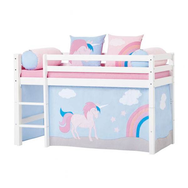 Forhæng til halvhøj- og køjeseng, Unicorn De håndsyede forhæng skaber en magisk og eventyrlig verden lige midt i børneværelset. Når forhænget monteres på sengen, er det ikke længere en seng, men i stedet et rumskib, et eventyrslot, en tidsmaskine eller no